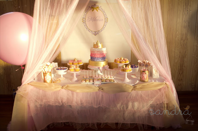 What better way to celebrate my daughters first birthday than to have a Royal Princess theme.. Fit for a true Princess! I love royal elegance and beauty, so I wanted to have gold and pink tones mixed with a touch of glittery glitz for fun! Milania's dress was handmade by Dinky Duke Designs. I wanted a classic style brocade fabric.. And this was just perfect! The princess cake was four layers of ruffles and four different flavours.. Topped with a beautiful jewelled Tiara. All cakes and desserts made by Sweet Bloom Cakes who perfected the royal princess theme, using gold, pinks and purples with handcrafted jewels and crowns. Cake stands supplied by Sweet Bloom Cakes Printable baroque Milania Frame customised by My Little Jedi - I added finishing touches of Gold German glass glitter Princess printable cake tags made by Polkadot Prints - I also added finishing touches of glass glitter Tulle Poms made by Shanz Party DecorationsParty bags and tags custom made by Sweet By Candy - I added finishing touches of pink and gold glass glitter Ruffles table skirt made by Candy Crush Events - I modified this by adding gold organza draping Milania's crown made by Handcrafted Crowns and Crystalised with Swarovski jewels by Crystalise Couture Large pink balloons and kids party cups and plates supplied by Occasion By DesignAll catering and food table setup by George Khouzame Catering, including guest table linens, napkins and tableware. All centrepiece, and dessert table styling done by Me! Our beautiful entertainer from fantasy fairy parties, Princess Rosa did a wonderful job! Her face painting was also amazing.. The wonderful Sandra from Photography by Sandra was absolutely beautiful to work with. She captured every picture perfect moment!