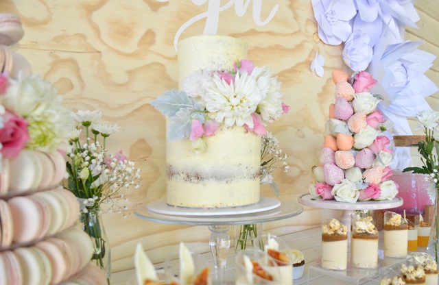 I made all the paper flowers and hand painted the plywood back drop, I also made all the cakes and desserts which comprised of a 2 tier semi naked cake with fresh flowers, I also did the floristry as well. A macaron tower with salted caramel, jaffa and raspberry and white chocolate macarons, finished with fresh flowers. A chocolate coated strawberry tower with fresh roses. The petite desserts were mango panacotta with macadamia praline, White chocolate cheesecake with raspberry curd and vanilla fairy floss and a salted caramel cheesecake mousse with caramel popcorn"